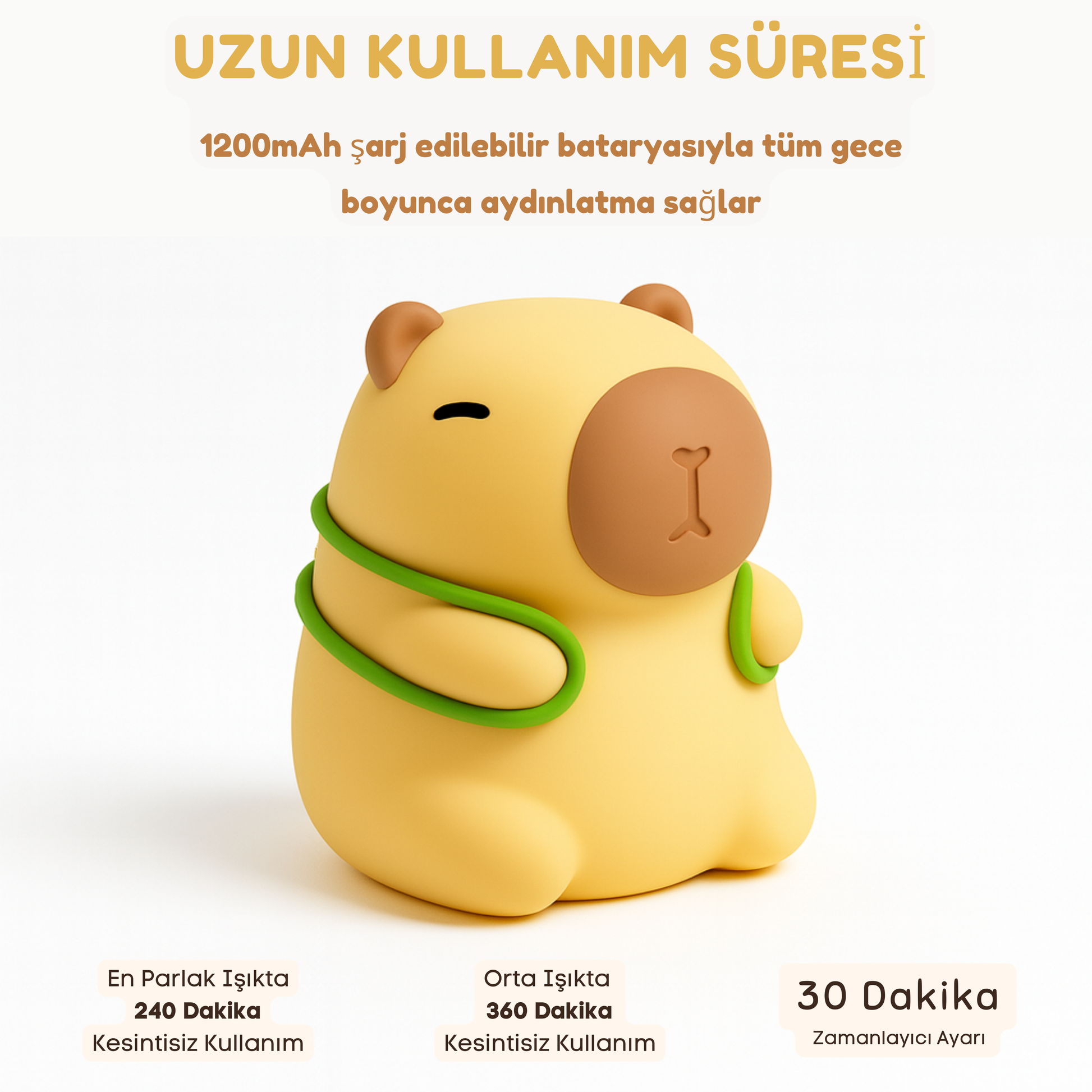 Yumuşak silikon gövdesi ve sıcak tonlu LED ışığıyla çocukların huzur içinde uykuya dalmasına yardımcı olur.